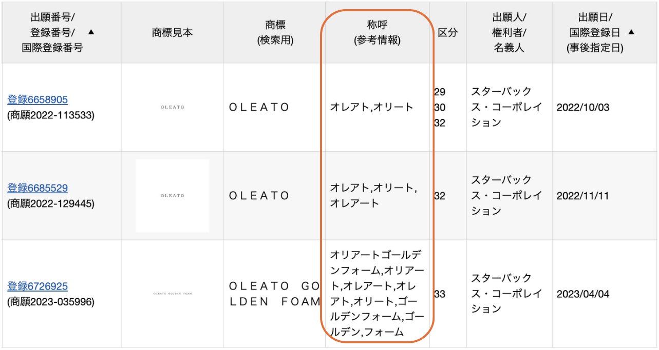 例えば、スターバックス・コーポレイションは、「OLEATO」という文字を含む商標を複数登録しています。同じ商標でも、称呼(参考情報)は「オレアト」「オリート」「オレアート」「オリアート」とさまざまです。
