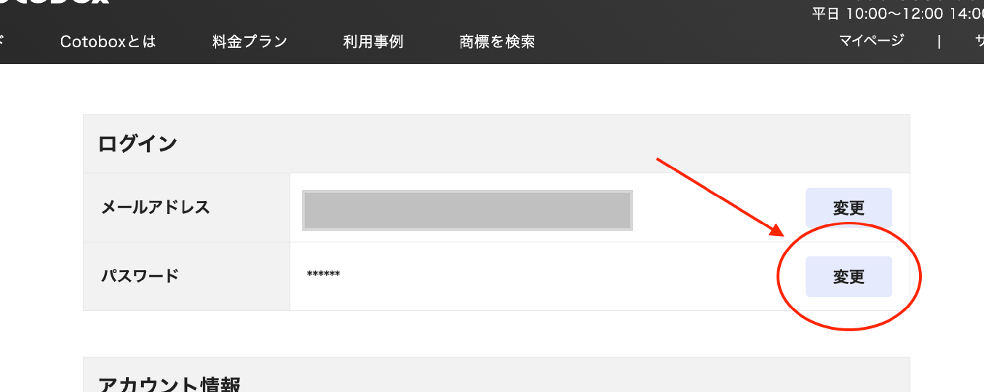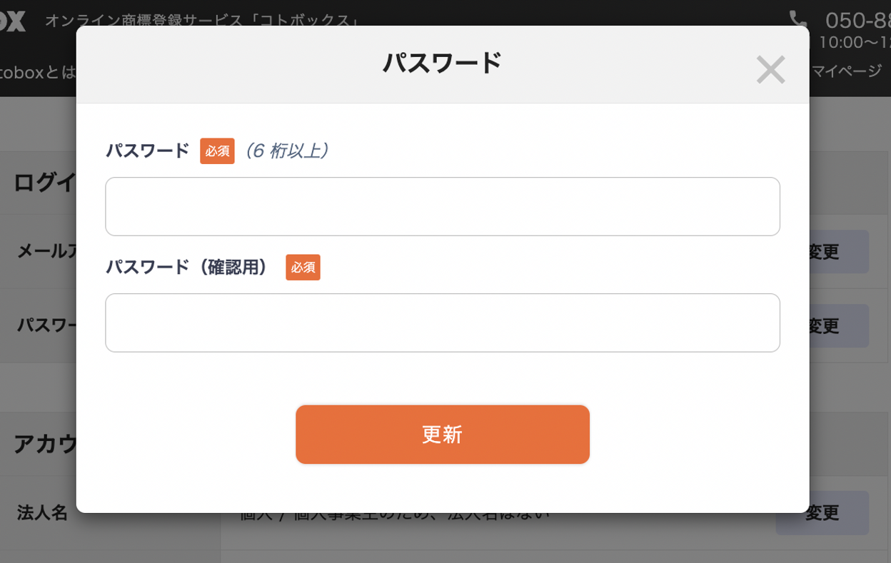 1️⃣ 画面右上「設定」をクリック2️⃣ 「パスワード」の変更ボタンをクリック3️⃣ 新しいパスワードを入力し「更新」をクリック 画面上部にメッセージが出たら、変更は完了です。** 無料アカウント登録 ** 電話で問い合わせる(0120-959-551) ** 無料商標相談の予約をする