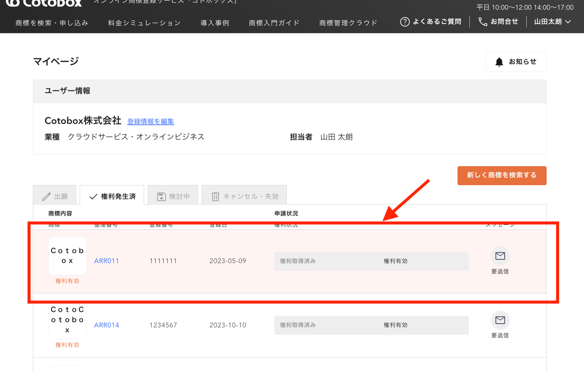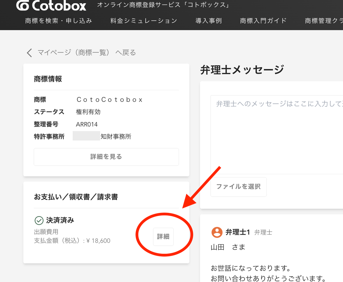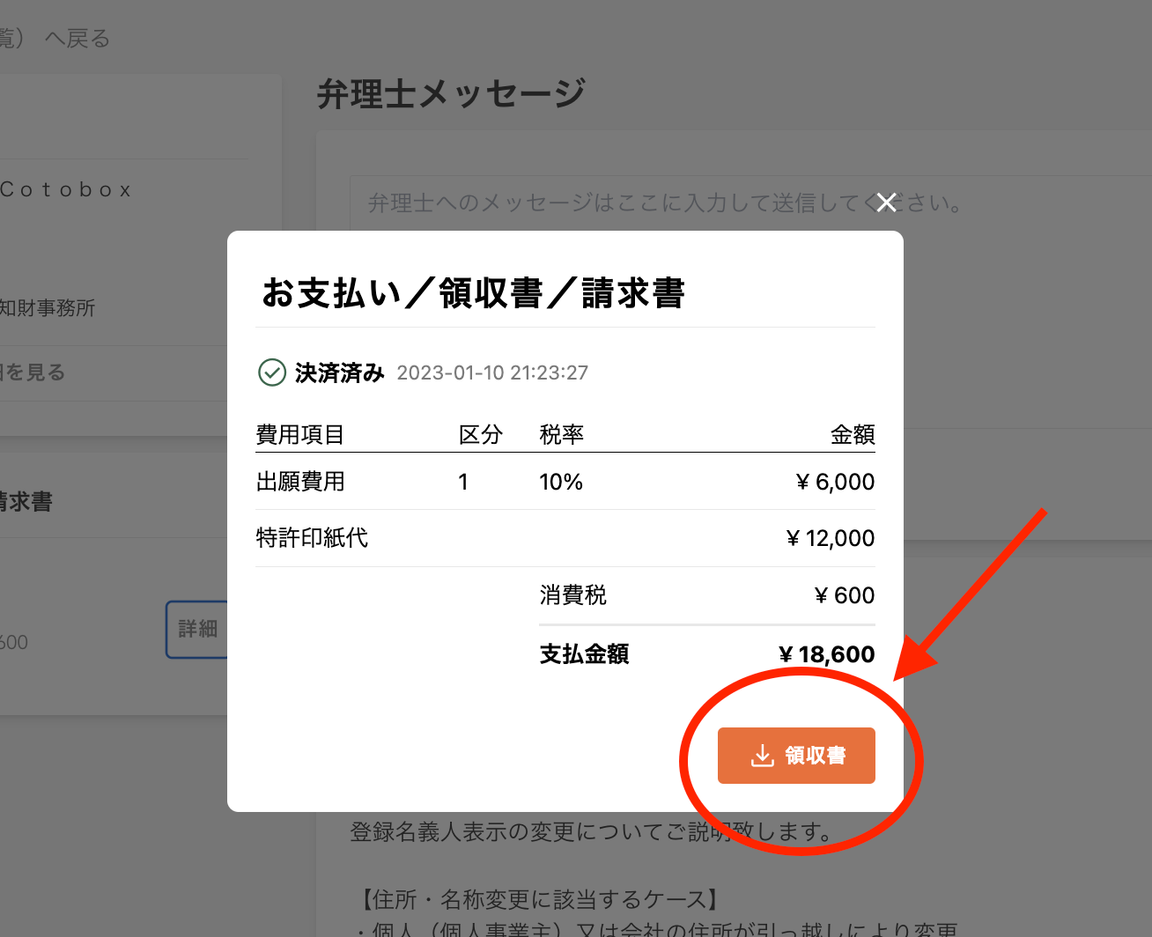 領収書はマイページへ即時発行されています。お支払い後、以下の手順でダウンロードしてください。※領収書の宛名は、原則出願人(=商標の権利者)のお名前・法人名でのみ発行いたします1️⃣ マイページにアクセス2️⃣ 発行したい商標を選択3️⃣ 対象の支払い情報詳細を選択4️⃣ 領収書ボタンよりダウンロード ** 無料アカウント登録 ** 電話で問い合わせる(0120-959-551) ** 無料商標相談の予約をする