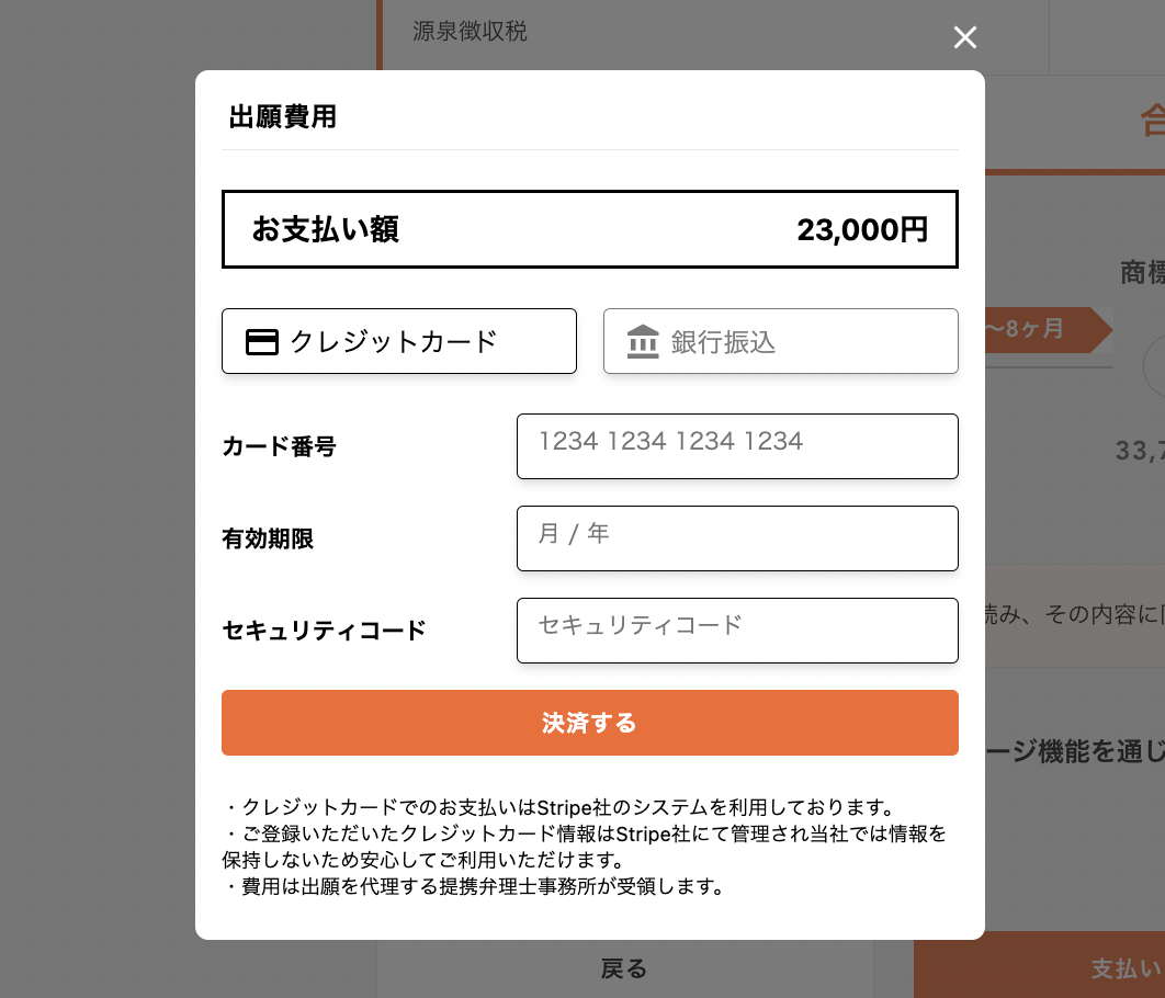 最後に、出願費用をお支払いいただくと申し込み完了です。