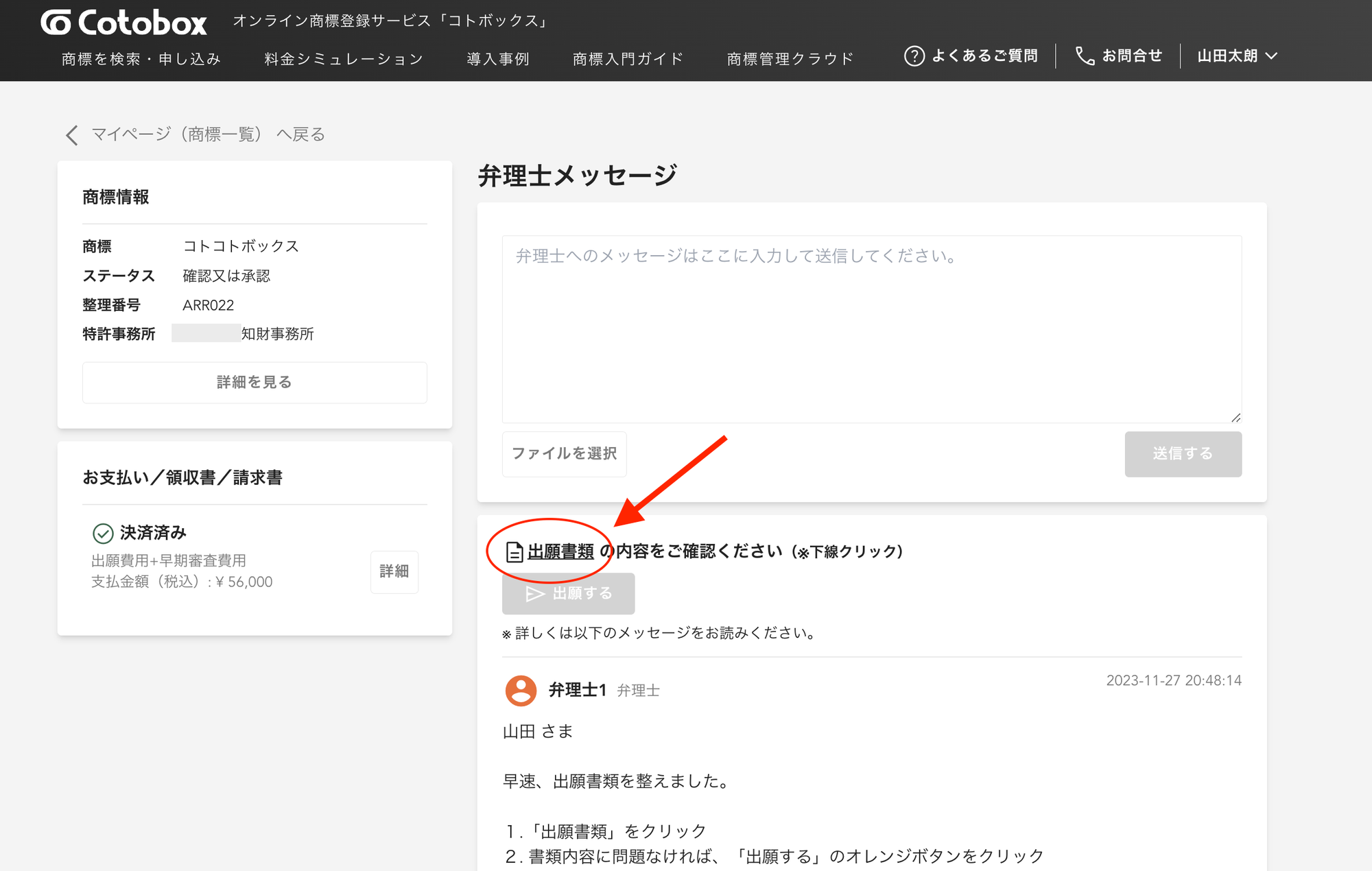 担当の提携弁理士が出願書類の作成を完了すると、マイページにデータが届きます。 出願書類の内容に間違いがないか、最終確認をしてください。